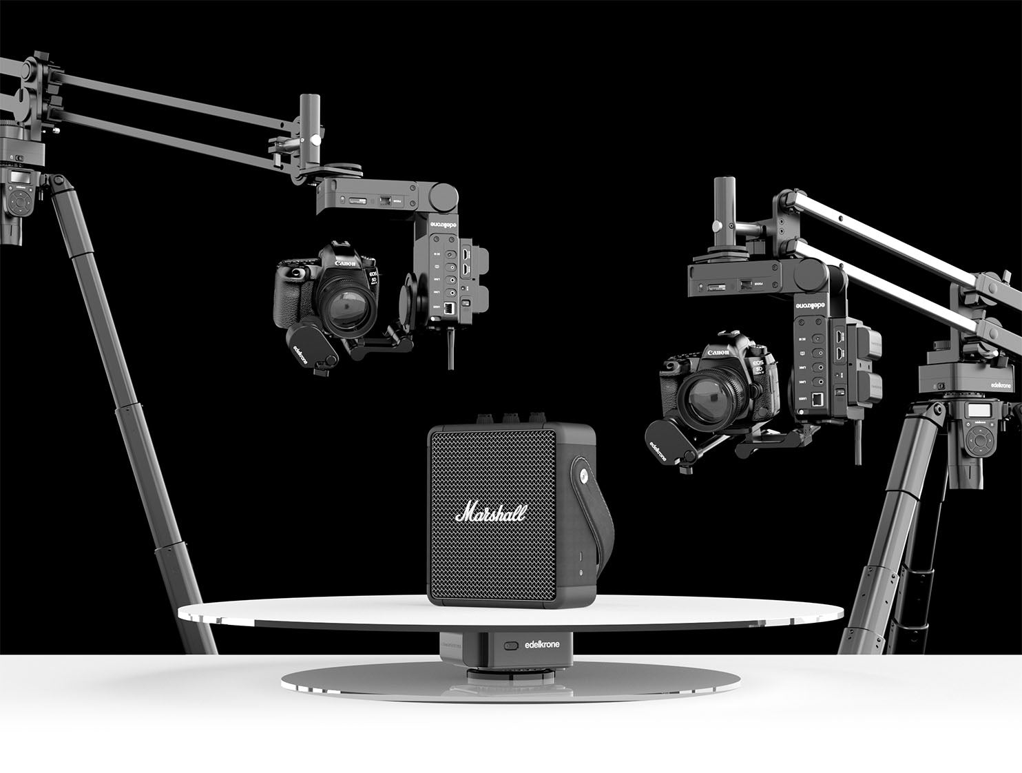 Tripod X, with its motorized height adjustment, makes working with JibONE a breeze. Adding the edelkrone Tripod Wheels allows you to effortlessly position the entire setup anywhere in the studio and set it up at any height with ease.